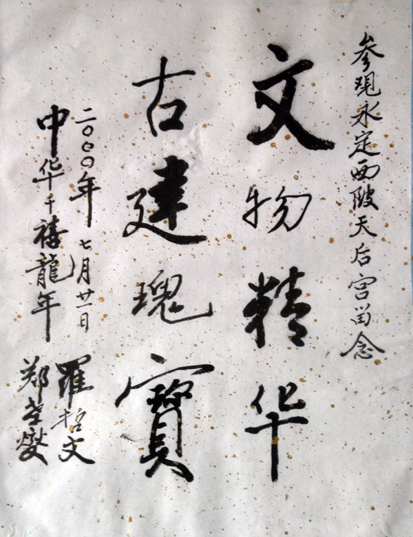 國家文物局古建筑專家羅哲文、鄭孝燮欣然為西陂天后宮后留下了“文物精華,古建瑰寶”的墨寶。