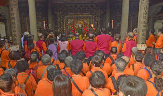 在湄洲天后殿里,150多名媽祖信眾備以五牲、五果和六齋、鮮花,焚香叩首,禮行三獻九叩,祈求媽祖神庇佑國民安康、合境平安。苑裡慈和宮是湄洲媽祖祖廟在臺灣的至親廟之一,創(chuàng)建于清乾隆36年(1724年),主祀康熙五十三年從湄洲媽祖祖廟分靈至苗栗的天上圣母。
